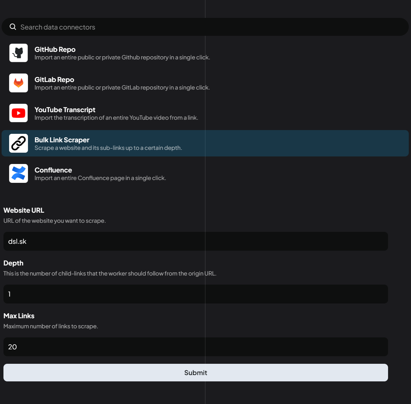 AnythingLLM provide you a possibility to scrap data from Internet site or pull data from repositories (GitHub, GitLab, YouTube transcript) and import them into RAG. Note: For Git solutions, you will need to obtain API key.